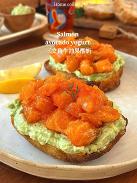这个食谱选用了优诺480g装的原味希腊酸奶,也叫优诺大白罐,在希腊酸奶里加入黑胡椒、海盐、芥末和柠檬汁调味,再加入牛油果泥一起搅拌,然后作为底酱铺在法棍上,最后将简单腌制过的三文鱼块放在上面即可,整份餐食并未刻意强调低卡和无糖,却自然实现了轻负担与高满足感的同步。